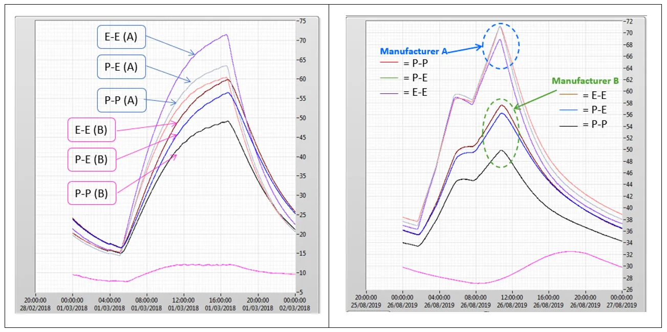 • Thermal and electrical stresses applied during these tests can affect the condition of joints and dramatically reduce their safety margins, confirming the eventual weaknesses of materials and designs. This is shown in Fig. 6 (right): in fact, the surface temperatures of samples from manufacturer A deviate substantially from those of manufacturer B and the ageing phenomena are evident. Also, from the insulation point of view, there seems to be an influence of the dielectric stress on acceleration of ageing phenomena. Temperature plots differ between the samples under voltage and those of the unenergized ring. Moreover, detailed analysis shows a modification in the order of merit of the different joint types. In the case of Manufacturer A, characterized by a pronounced ageing, the P-P joints reach the highest temperatures, while the E-E joints remain cooler. This is a dramatic change in performance, probably linked with a rapid degradation of the paper portion of the joint: in this case the materials and configuration (manufacturer A) are weaker than expected (this change is not observed in the better performing equipment from manufacturer B).