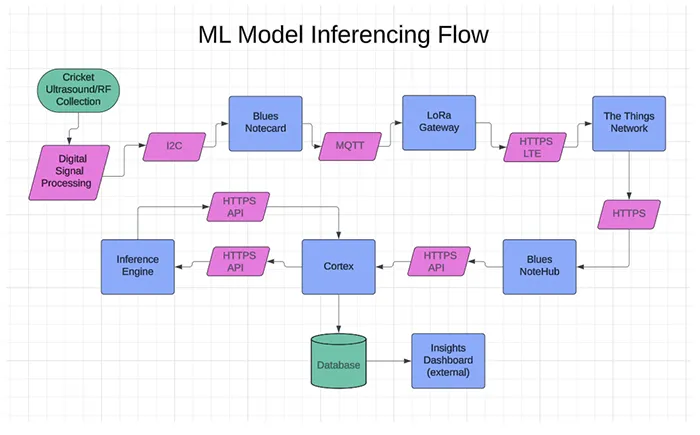 The acoustic, radio sample features and a set of environmental readings are packaged and sent from the Cricket devices over long range, low power radio to gateways (LoRa), or over LTE where available to a cloud system (e.g. CRWN Cortex). On the cloud servers, the features are run through a series of models to produce predictions and report these readings back to the utility.