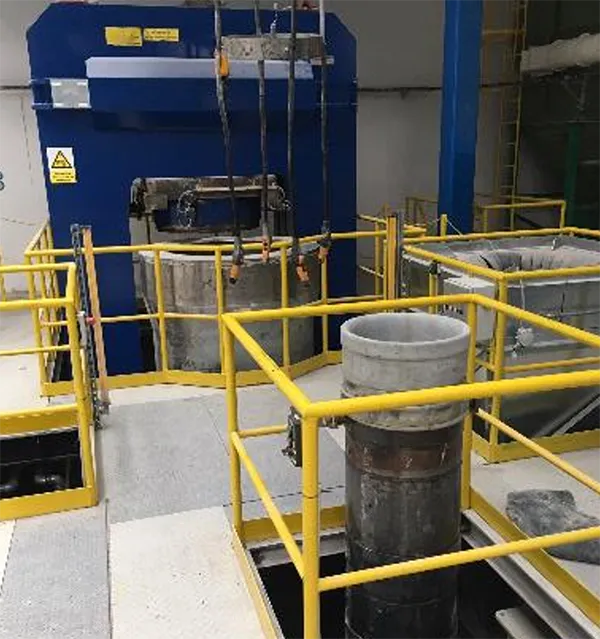 From the silos the powder is moved to the filling area where a rubber cannister inside a steel cylinder is filled. The filled cylinder is then transported by a carousel crane to the press (see Fig. 3).