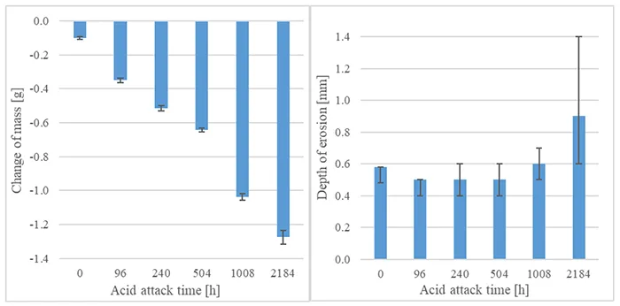 Mass loss and depth of erosion for different durations of acid attack were evaluated for one material and are presented in Fig. 17. Overall mass loss increases with longer duration of acid attack, but depth of erosion does not follow this increase. Up to 1008h, depth falls between 0.4 and 0.6 mm and only increases significantly after 2184h acid attack. (Note: Maximum and minimal depths of erosion are indicated in Fig. 17 with error bars.)