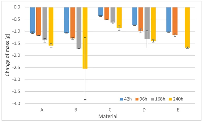 Five samples were placed in containers each with 1.3l of acidic solution and stored at 35°C for defined periods: 96h, 240h, 504h, 1008h and 2184h. When storage time elapsed, the samples were removed from the acidic solution, rinsed with de-ionized water and left to dry at room temperature for about 12h.