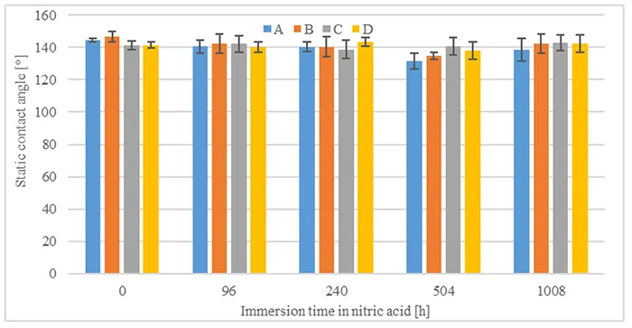 Static contact angles for different acid immersion times and after a total transfer time of 1008h were evaluated as well. Fig. 13 shows that static contact angles reach values around 140° after the period being evaluated, irrespective of acid immersion time.