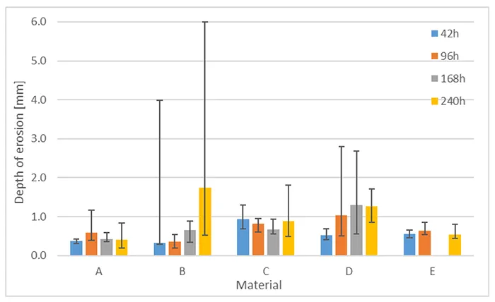 Fig. 19 shows erosion depth for these materials. Error bars indicate minimum and maximum measured erosion depth. As evident, erosion depth does not follow the same increasing trend as does mass loss. Two outliers can be observed as well, both for a sample of Material B. One of these samples shows an erosion hole and failed as well due to current exceeding 60 mA.