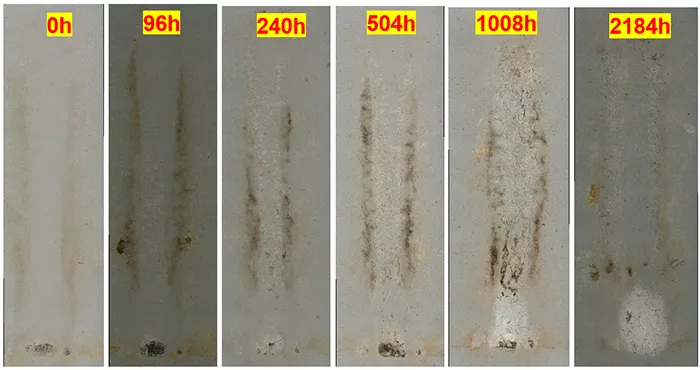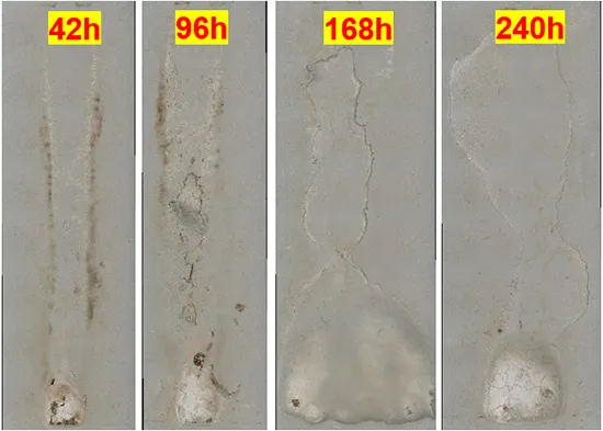 Boiling was shown to influence length and depth of erosion in specimens without pre-stressing by acid attack. Influence of pre-stressing by boiling for different times after 504h of acid attack was investigated as well and Fig. 16 shows the results. Compared to erosion after 504h acid attack as in Fig. 15, the honeycomb pattern of erosion now covers the same area but is deeper and in places begins to resemble bulk erosion. After 168h boiling, the honeycomb pattern of erosion is fully replaced by complete bulk erosion of the surface between electrodes.