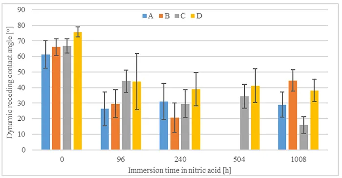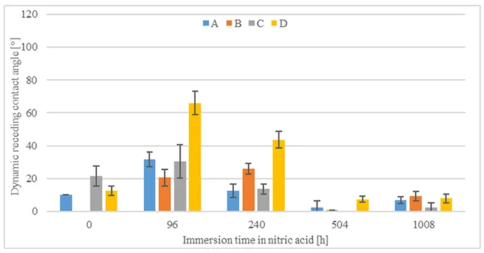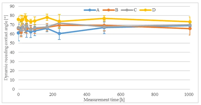 Fig. 9 shows initial measurements of dynamic receding contact angles after 16h of transfer time and after different durations of acid immersion. It can be observed that contact angles measured without acid immersion are below 20° and in case of material B cannot be measured at all. This indicates low to no hydrophobicity transfer at this point. The same can be observed for measurements after 504h and 1008h of acid immersion. Measurement after 96h shows especially high dynamic receding contact angles, in the case of material D reaching above 60°.