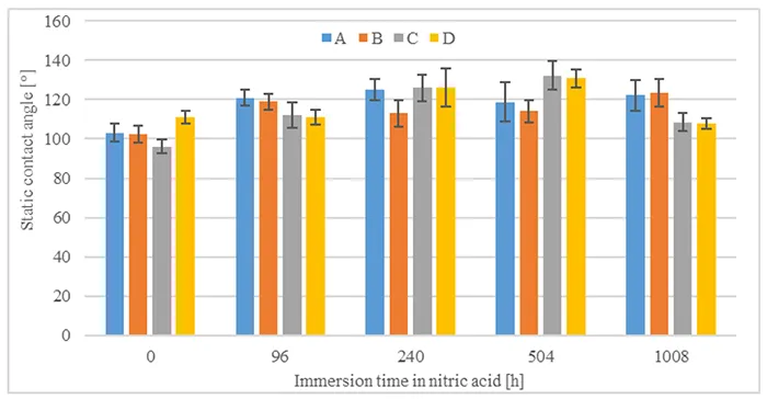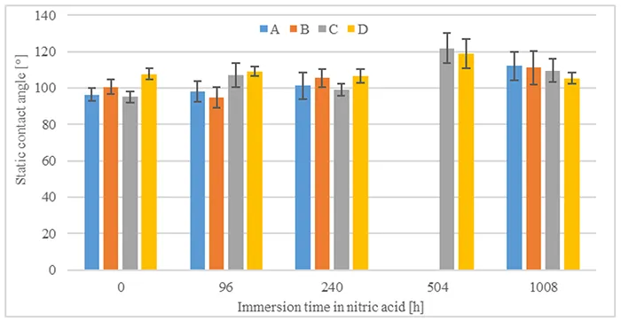 It is also interesting to compare static contact angles after 1008h of recovery and different acid immersion times, as shown in Fig. 8. Static contact angles show an increase compared to the same materials without pre-stressing.