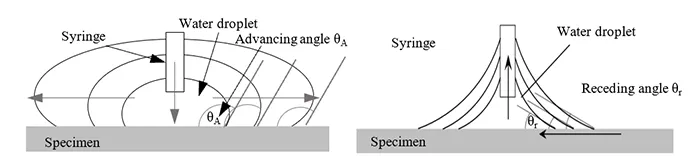 • the remaining 10μl of water removed by a syringe at a rate of 0.2μl/s followed by measurement of receding contact angle (see Fig. 2 right).