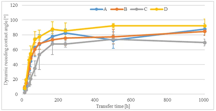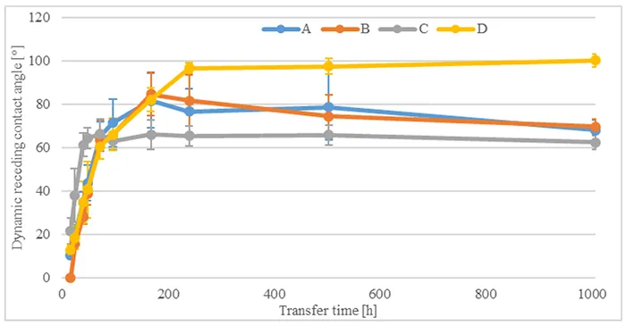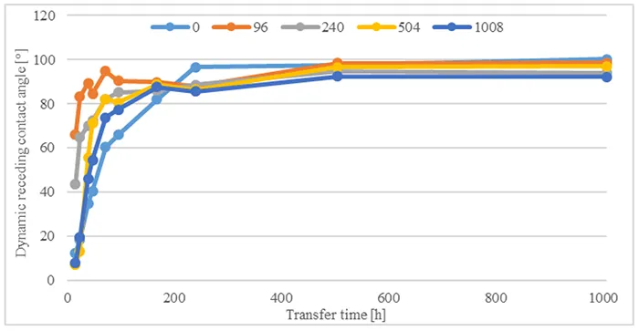 Contact angles were measured after defined intervals of 16h, 24h, 40h, 48h, 72h, 96h, 168h, 240h, 504h, and 1008h. Compared to previous investigations, contacts angles were measured at more points in time. This was regarded as especially important at the beginning of the transfer time since a rapid increase in receding contact angle has been observed at that point.