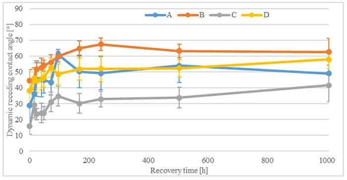 Over time, it is expected that dynamic receding contact angle will recover close to its initial state. Fig. 7 shows the increase in dynamic receding contact angle over the entire recovery period after 1008h of immersion in acid. As can be seen, receding angles recover to higher than 40° for all materials. Dynamics of hydrophobicity recovery observed for shorter acid immersion times show similar behaviour.