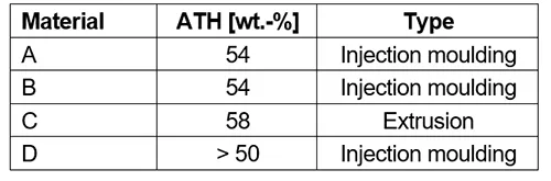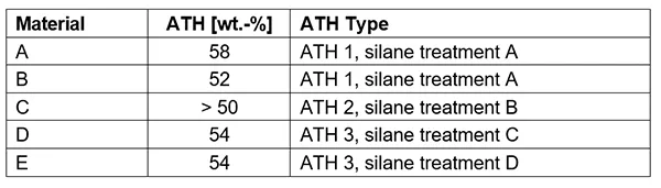 Multiple materials were tested with the main difference between them being in content of ATH filler. In addition, ATHs of different type and surface silane treatment were also investigated. Table 2 lists the different materials tested and indicates percentage of wt.-% content as well as silane treatment of the ATH in the formulation.