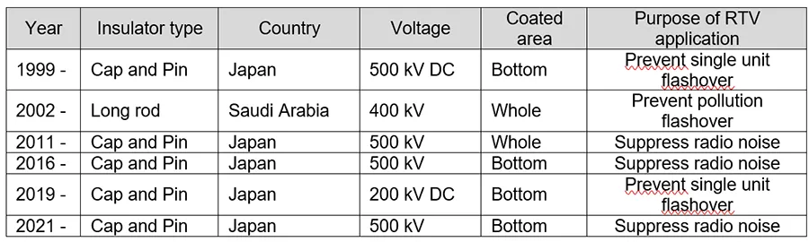 Table 1 summarizes selected field application of RTV coated insulators where there have been no reported issues since 1999.