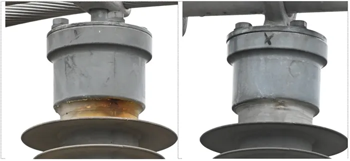 Visual inspection reveals basic deterioration such as biological growths (leading to localized loss of hydrophobicity), installation errors, handling damage or lack of quality control. It can also reveal corrosion and traces of electrical activity in the vicinity of the end fitting. Where severe internal damage exists, there will be traces from electrical activity further down the insulator and in the worst cases punctures and cracks (see Figs. 2 & 3).