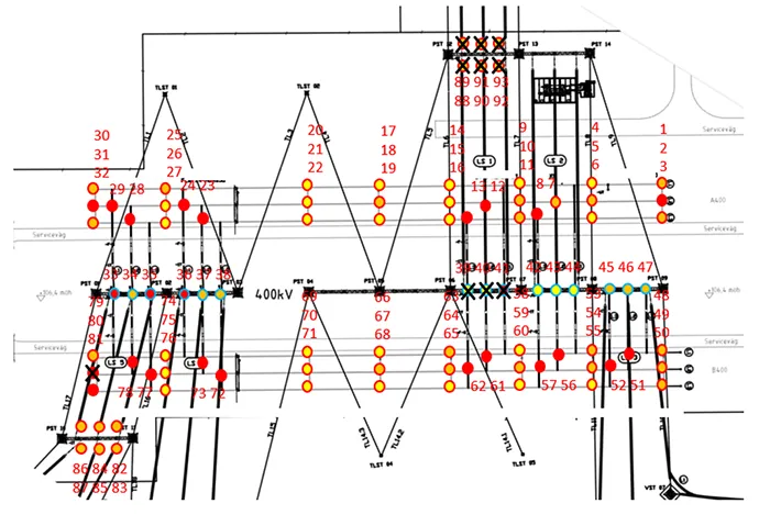 Once the status assessment for any individual substation has been completed, this is implemented into a substation layout to best prioritize replacement of station posts (see Fig. 14). This is performed for each substation where composite station posts have been installed.