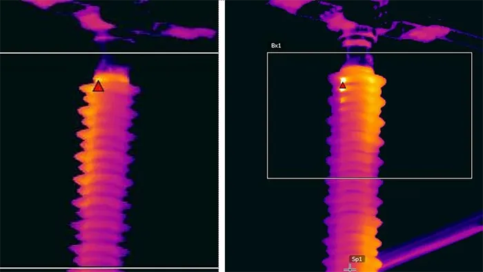 It is important to note that heat transfer is slow. A good insulator from the dielectric perspective is also usually a good insulator from the thermal perspective. Thus, any internal heat source may not appear as hot on the surface of the housing as internal damage might suggest it should. Still, any internal defect close to the housing, at the observer’s side, will generally show more than 5°C of heating (in extreme cases up to approximately 100°C). Moreover, internal heating may not show on all sides of the insulator in the case of larger diameter station posts. Figs. 8 & 9 provide two examples.