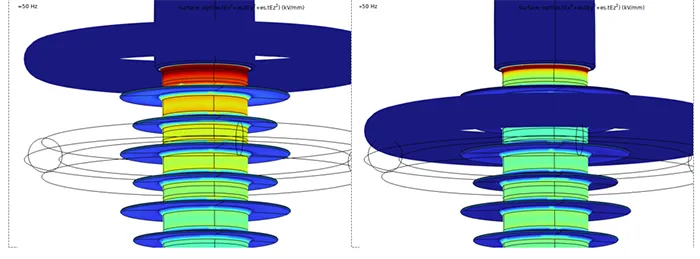 An example of re-designing the grading ring on a 400 kV insulator is shown in Fig. 16, where the ring has been moved 80 mm downwards to reduce maximum electric field strength along and within the insulator by approximately 35%.