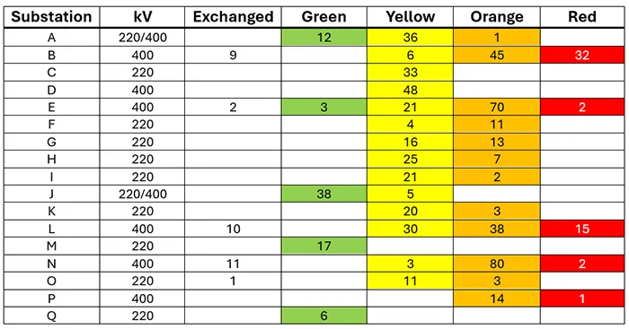 All substations will be listed with their overall population of station posts as well as the latest status assessment for each (shown in Table 1). It should be noted that a “red” insulator might have damage reaching between 3% and 35%, resulting in urgency to remove it from service.