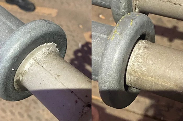Though seals also suffered from pecking with some parts missing, dye penetration tests conducted on 4 damaged insulators showed no penetration into the sealing materials. This suggests the seals still effectively prevent water ingress that could harm the core/fitting interface and threaten mechanical integrity. Currently, there is no immediate threat to mechanical withstand capability. However, long-term risk exists if the glass fiber core becomes exposed due to severe trunk pecking, which would then require insulator replacement.
