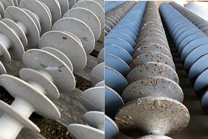 During inspections at construction sites, some insulators were discovered to have been exposed to pollutants due to improper storage (see Fig. 10). Despite this oversight, these retained their hydrophobic properties and maintained electrical integrity, thereby only reinforcing their good performance in polluted environments.