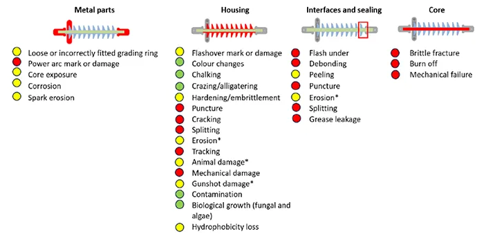 Using a traffic light pattern, the corresponding rating for appropriate action is presented. It is important in this regard to clearly differentiate between a failed and a damaged insulator, even though both are marked red. According to CIGRE TB 481 the criterion failure means that an insulator can no longer support the operational mechanical load or electrical stress. This can be attributed to mechanical failure or brittle fracture (listed under ‘core’) and in both cases the insulator is probably broken, and a conductor is on the ground. In all other RED cases, insulators should be replaced at the first planned outage. This assumption is based on service experience that shows that even a weakened unit with cracks, core exposure, erosion or peeling of seal will survive another year or so due to the relatively slow speed of degradation.